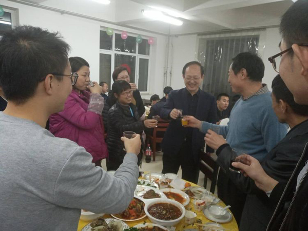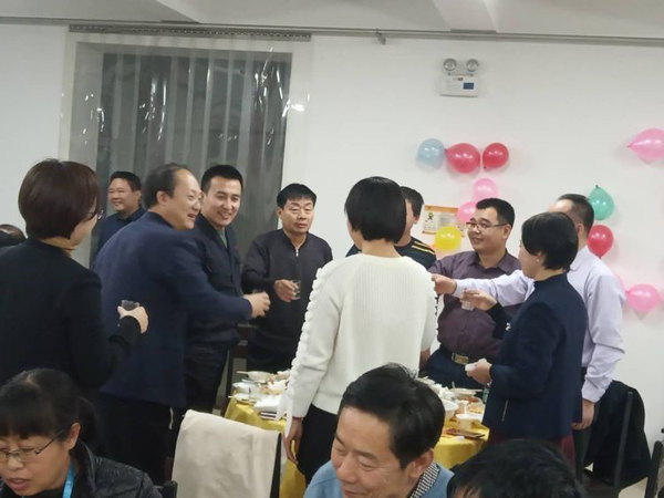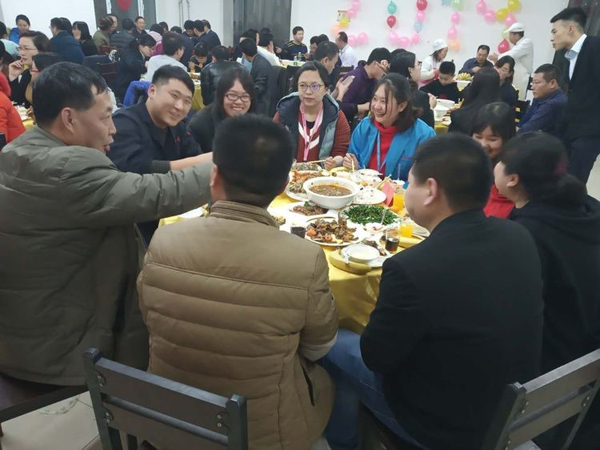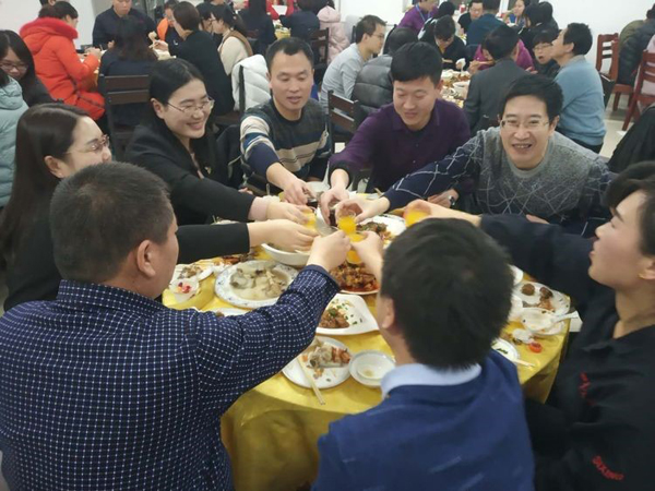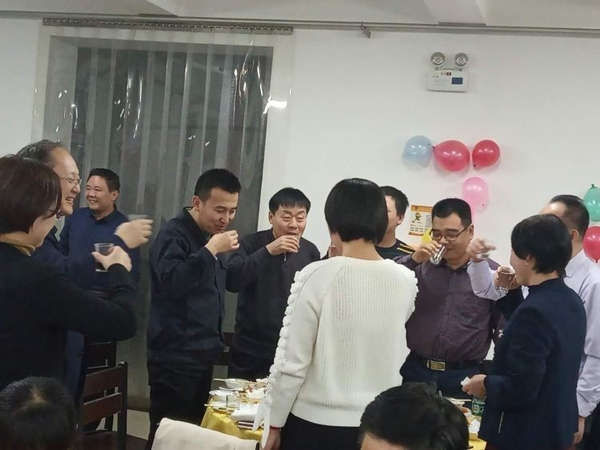 銷售內(nèi)務部李蒙蒙介紹自己的燒茄子,小編疏忽,只留下一張主廚的精彩發(fā)揮照 ◆ 相互敬酒 同事,職工朋友們相互敬酒,場面堪稱宏偉壯觀啊