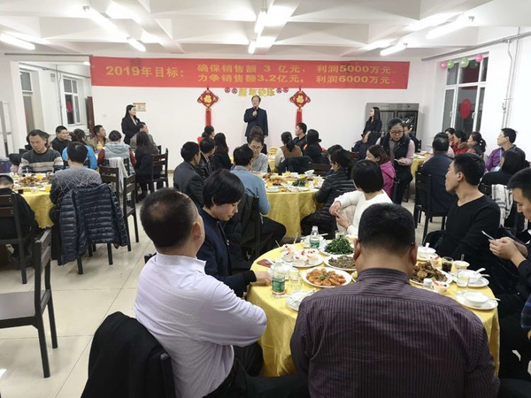 銷售部王云濤總,傾情提了四杯酒,敬董事長,敬自己,敬幕后人員。郝總代表大家為王總斟了一杯大酒,希望他2019年業(yè)績所向披靡,拿下5000萬目標。他中招干了半杯,銷售酒量一般都是兩斤啊,神勇。后勤部王震山總勇猛做陪,一起炸了半杯。