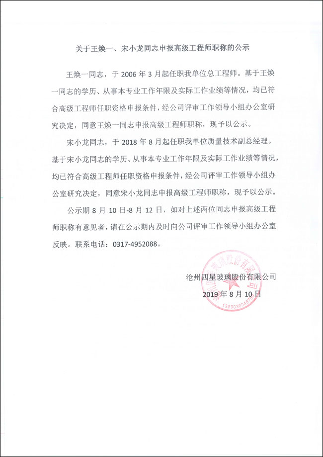 | 關(guān)于王煥一、宋小龍同志申報(bào)高級(jí)工程師職稱的公示 |